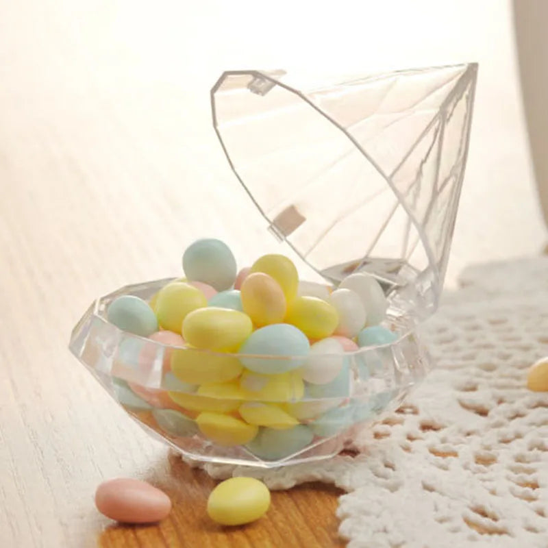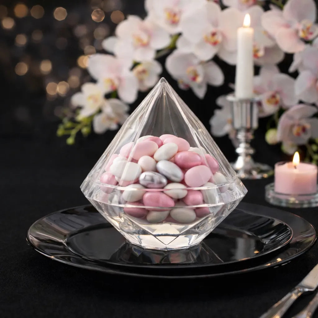 Apportez une dimension précieuse à votre décoration grâce à ce contenant à dragées diamant au design spectaculaire. Sa silhouette facettée reflète la lumière sous différents angles et crée un effet brillant digne d’un bijou. Sa transparence met délicatement en valeur les couleurs des dragées tout en conservant une présentation élégante et épurée. Idéal pour un mariage ou une réception raffinée, il attire instantanément le regard et sublime votre mise en scène.