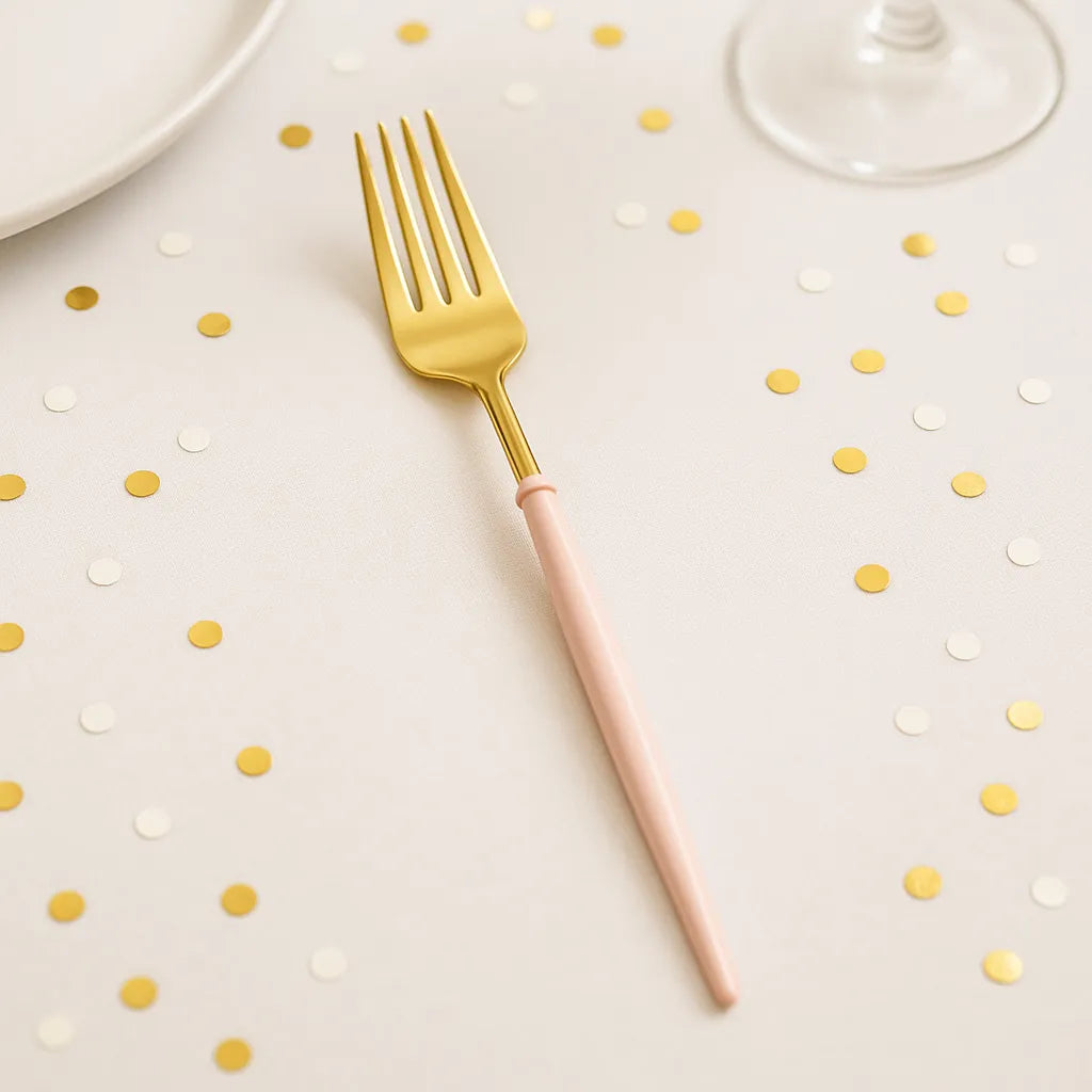 Le contraste entre l’or brillant et le rose poudré crée une harmonie visuelle douce et élégante. Chaque fourchette est conçue pour sublimer votre décoration de table, sans effort. C’est l’accessoire idéal pour impressionner vos invités tout en gardant une ambiance chic et chaleureuse.