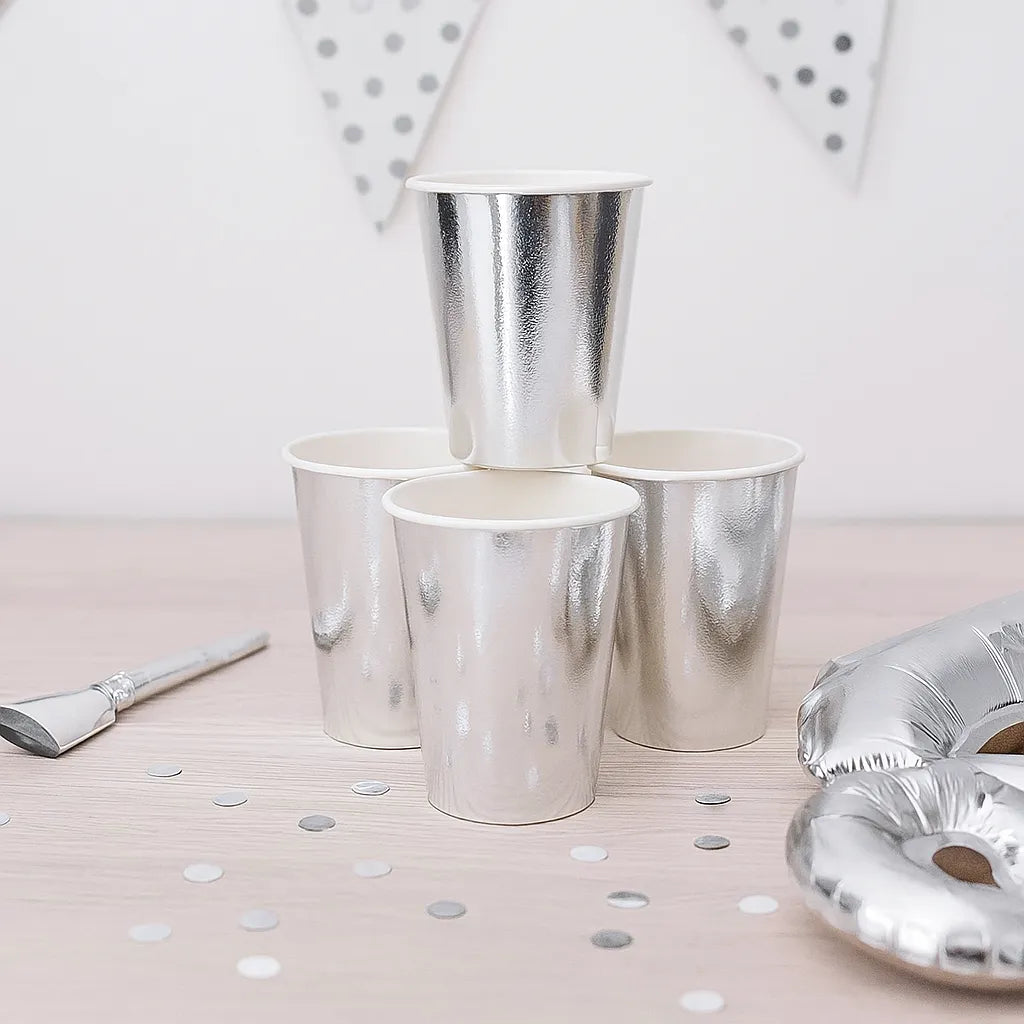 Fabriqué en carton de qualité, ce gobelet argenté est à la fois solide et jetable, facilitant le nettoyage après la fête. Son design raffiné convient à toutes les boissons et s'harmonise facilement avec des accessoires de table assortis pour une présentation élégante et cohérente.