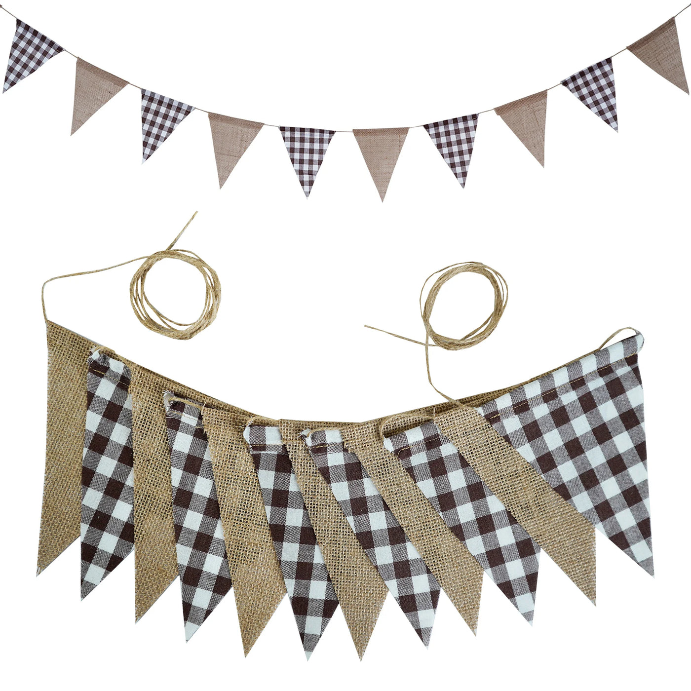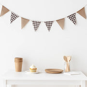 - Le kit est composé d’une guirlande avec des drapeaux en forme de triangle en tissu et en jute avec des carreaux marrons et blancs.