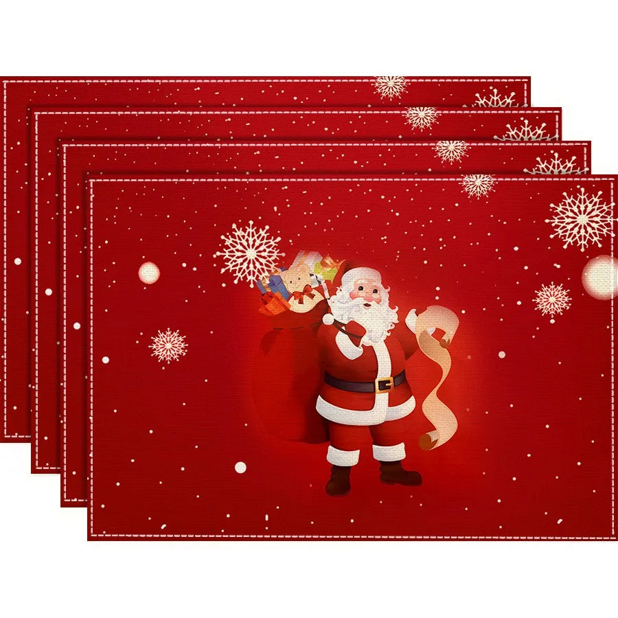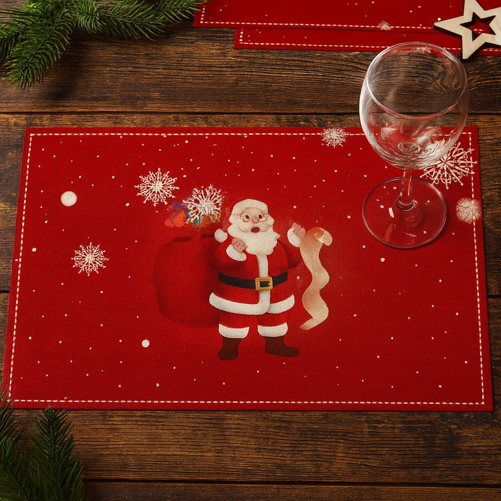 - Ce set de table rouge orné d’un Père Noël jovial et de flocons de neige illumine votre table de fête.